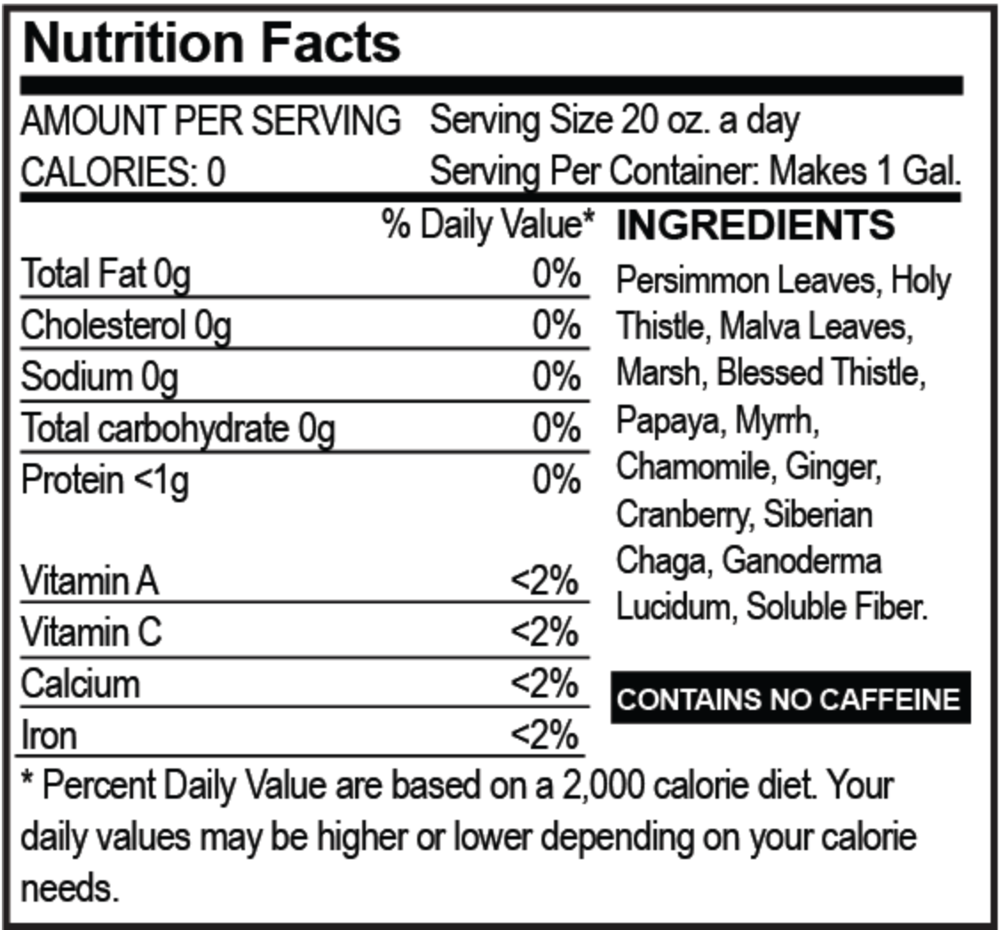 Persimmon Leaves, Holy Thistle, Malva Leaves, Marshmallow Leaf, Blessed Thistle, Papaya, Myrrh, Chamomile, Ginger, Cranberry, Siberian Chaga, Reishi, and Soluble Fiber.